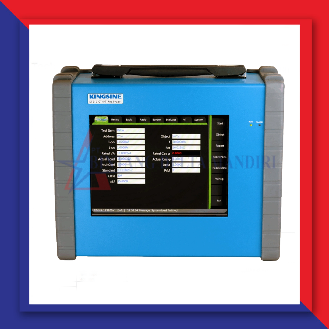 The KINGSINE KT210 CT/PT Analyzer is a compact and advanced testing instrument specifically designed for the comprehensive testing and evaluation of current transformers (CTs) and potential (voltage) transformers (PTs). It automates a wide range of tests to assess accuracy, excitation characteristics, ratio, polarity, burden, and phase displacement, ensuring compliance with IEC and IEEE standards.